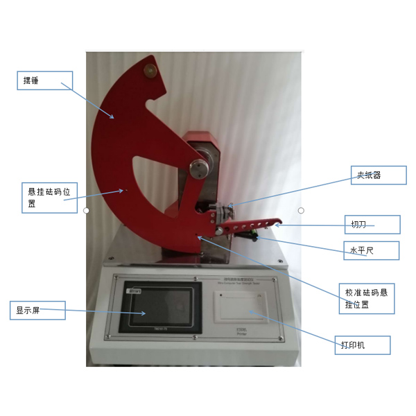 擺錘:產生撕裂力矩,撕裂試樣; 夾紙器:用于夾持、固定試樣; 切刀:在試樣上切出撕裂口; 顯示屏:點陣式液晶顯示屏,系統操作界面; 打印機:微型高速熱敏打印機; 按鍵面板:用戶對儀器進行操作的面板; 安裝腳:四個安裝腳,可調節儀器安放的水平性和穩定性