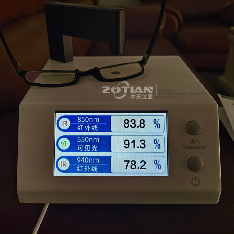 OT-850B鏡片透過率測試儀的測試原理是采用紅外850nm光源,紅外940nm光源和可見550nm光源照射被測透明物質(zhì),感應(yīng)器分別探測三種光源的入射光強和透過被測透明物質(zhì)后的光強,透過光強與入射光強的比值即為透過率,用百分數(shù)表示。